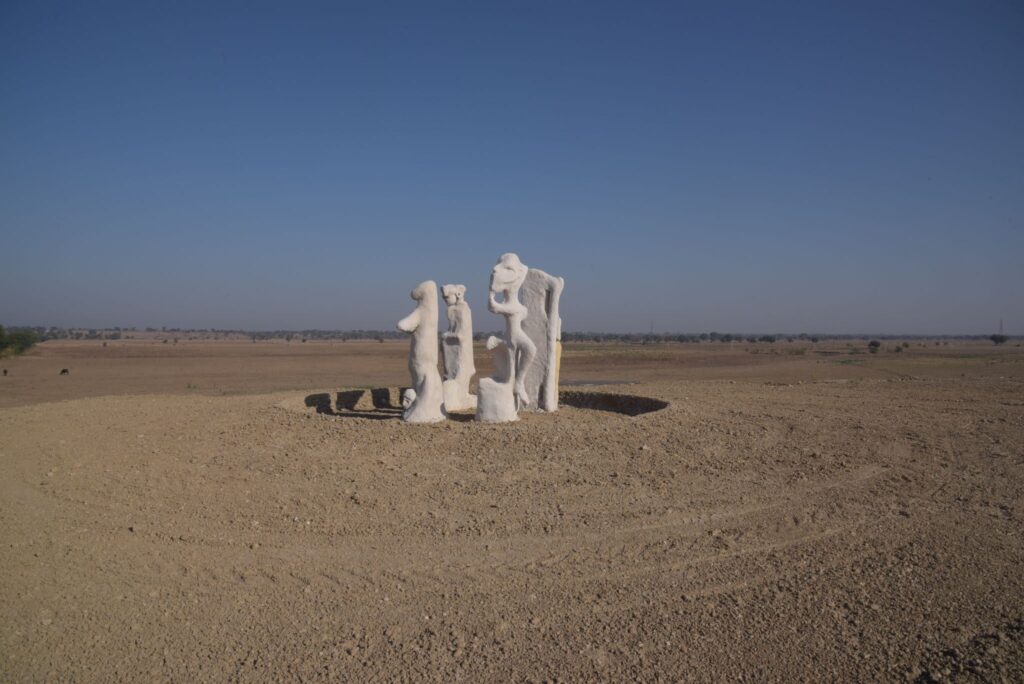 Regardless of the distance, the stories remained the same and the only thing that changed were the elements. Those stories eventually informed ‘Whispers of the Village’, his first major self funded project. “The story consists of a character named Bui, who embodies a plant, and how it is killed by an outside invader.” He began building the sculpture during COVID, with the help of school students around the area. “It emerged through spontaneous collaboration.” As the piece took shape on a water harvesting mound, it became something people recognised, responded to, and later remembered. “Eventually, there was nothing left as it eroded naturally. But people saw it and talked about it. Now it’s no longer there, and in this process, the sculpture itself came to embody a memory or a myth.”